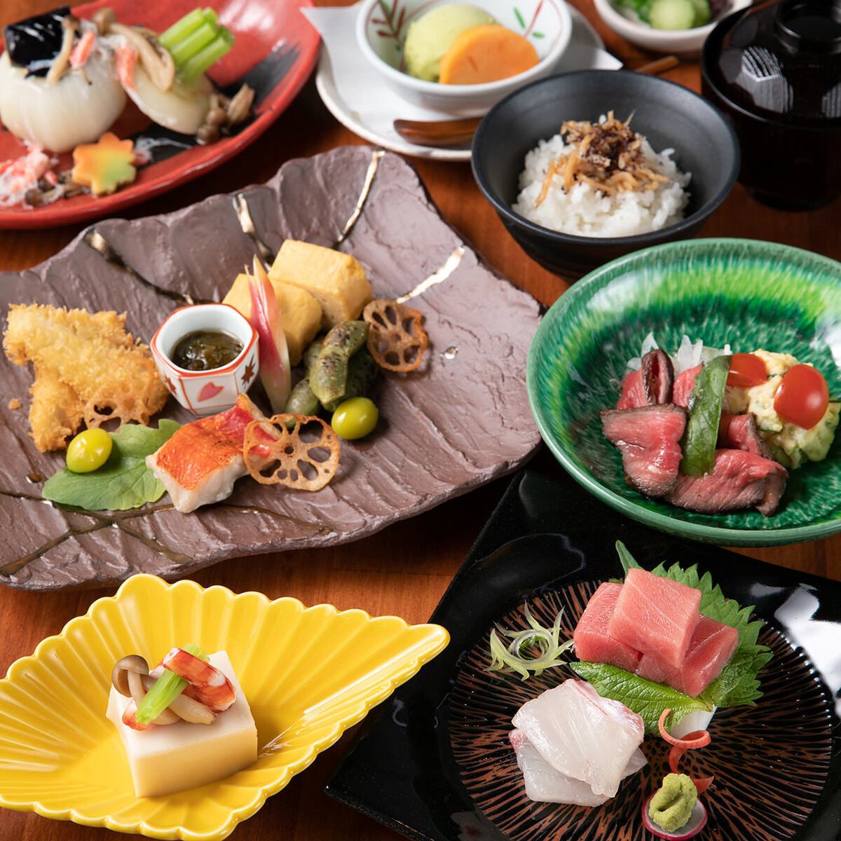 当店の「雪コース」は、ディナーにぴったりの和食コースで、デートや記念日、大切な日に最適です。季節ごとに変わる旬の食材を用い、熟練の料理人が丁寧に手作りした料理は、どれも一品一品が心に残る味わいです。大切な方との時間を、上質な和食で贅沢に楽しんでいただけます。思い出に残る夜をお過ごしください。(写真はイメージです 季節により内容は変わります)